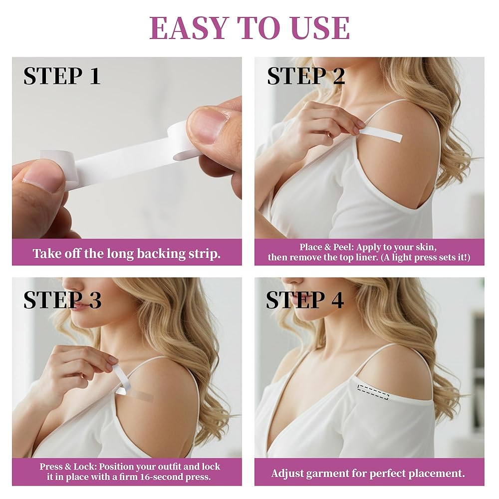 Lock the fit Unleash confidence: Achieve flawless outfits in seconds with our versatile dress tape fabric to skin technology.Designed to keep plunging necklines, slipping sleeves, and gaping seams securely in place, this reliable dress tape works seamlessly under any clothing. Dance, laugh, and move freely without constant adjustments – it's your secret tool for effortless elegance