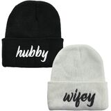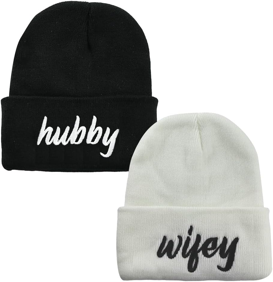 Funny 2 PCS Hubby and Wifey Beanies Material: The 2 PCS Hubby and Wifey Beanie is Made of Highly Stretchable 100 Percent Acrylic. 2 PCS Hubby and Wifey Beanie Beanie Hats for Men Women Will Be a Necessary Winter Hat in Cold Weather for You, You Will Like This Cuffed Beanie and Use It for a Long Time.