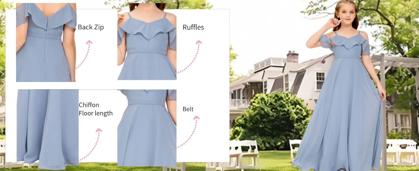 Elegant and Trendy Design: Featuring a stylish high-neck and delicate spaghetti strap design, this dress has playful off-shoulder details that cascade beautifully over the arms. The elegant chiffon skirt flows gracefully to the floor, enhancing your little one's silhouette with an A-line cut and high waist pleating