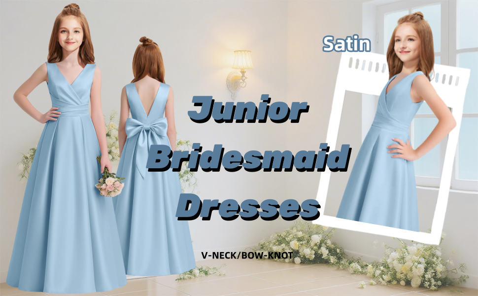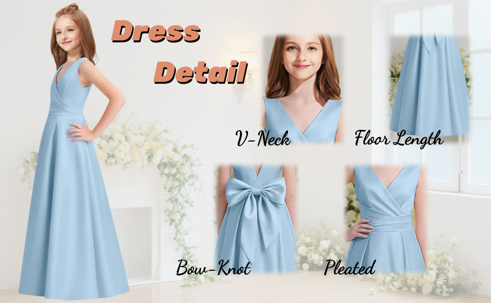 Feature: V-Neck Sleeveless Junior Bridesmaid Dresses, Satin Pleated Girls Bridesmaid Dresses with Bow, Long A-Line Flower Girl Dress for Teen Girls Wedding Guest Formal Dress