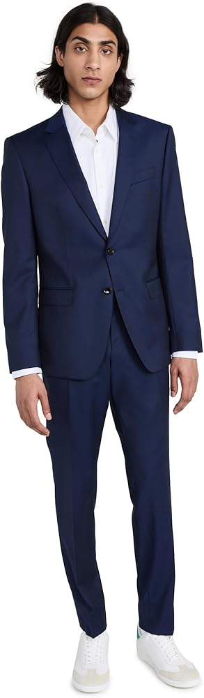 Notched lapels and single-breasted button placket with tonal topstitching, Long sleeves with button cuffs and padded shoulders, Welt breast and flap front pockets, Interior jacket welt pockets with button closures, Double back vent, Pant cuffs come unhemmed for customizable tailoring