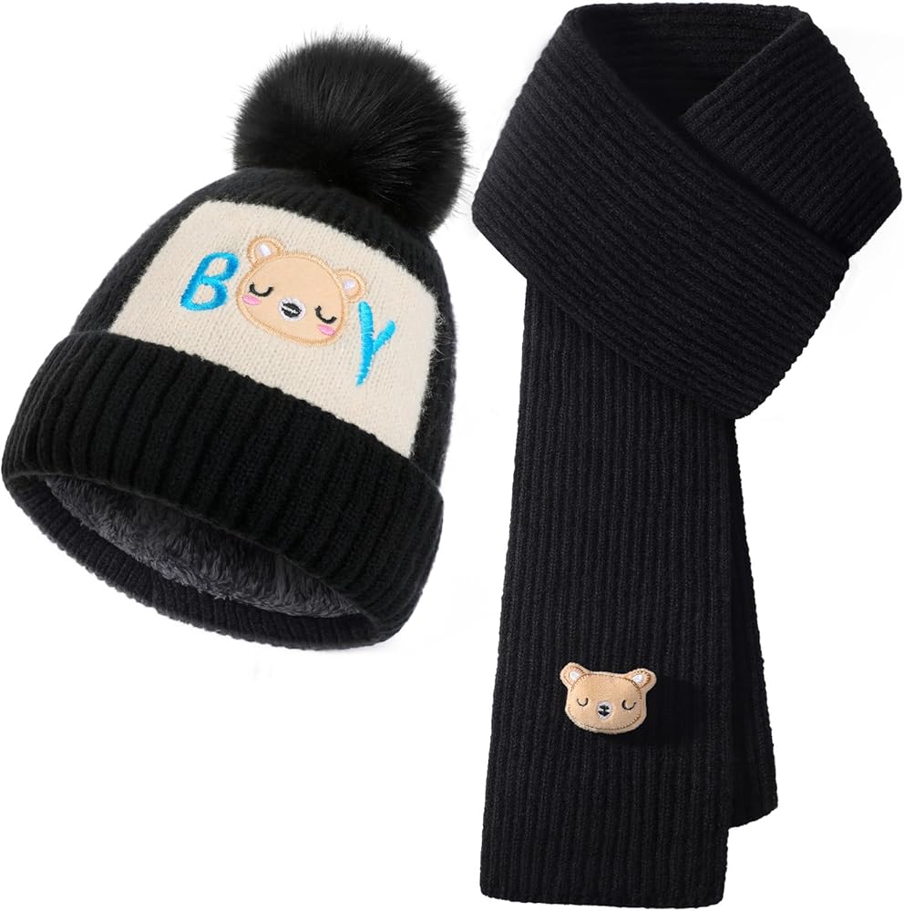2Pcs Kids Winter Hat Scarf Set, Warm Fleece Lining Girls Winter Hats with Pom, Knit Scarf for 3-12 Years Boys Girls