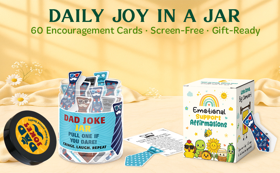 🎁PREMIUM QUALITY JAR & DURABLE DAD JOKE CARDS – This dad joke jar is crafted with a sturdy, reusable container and high-quality dad joke cards printed on thick cardstock to keep your daily dad jokes fresh for years. A perfect pick for dad joke gifts, funny dad jokes, dad jokes cards, and even funny gag gifts. Built to last ideal as a thoughtful dad jokes gift, funny dad birthday gifts, or cool things to buy for dad.