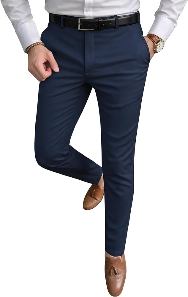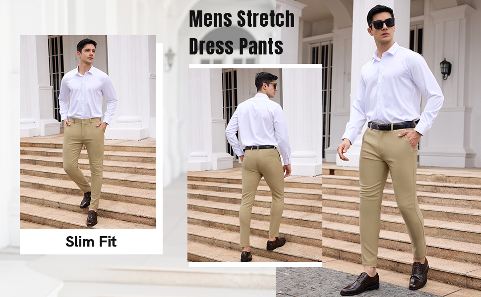 Features - This mens stretch dress pants feature a slim fit with tapered legs for a clean, streamlined silhouette. Designed with an expandable waistband, smooth zipper fly and button closure, functional pockets, and reinforced stitching for added comfort and durability