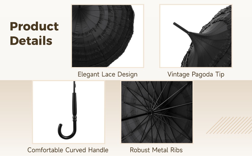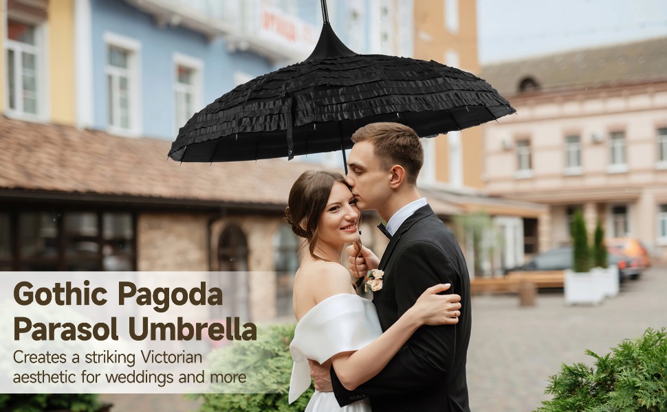 【Elegant Gothic Style】 Features a dramatic pagoda silhouette with layered lace accents; creates a striking Victorian aesthetic for weddings, cosplay, or themed photoshoots; offers great visual impact in vintage-inspired outfits and outdoor events