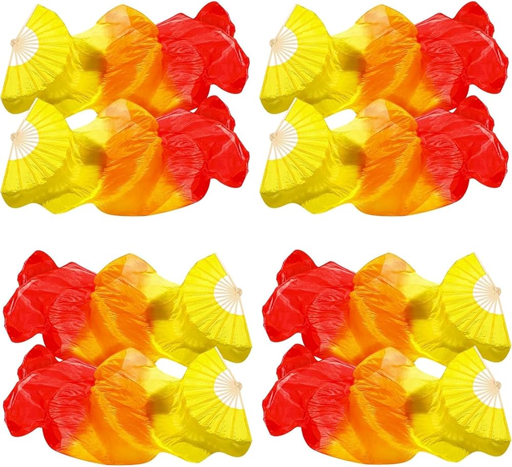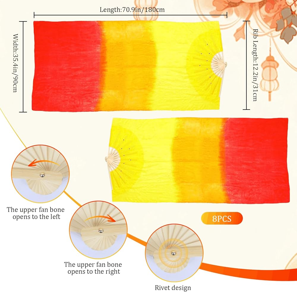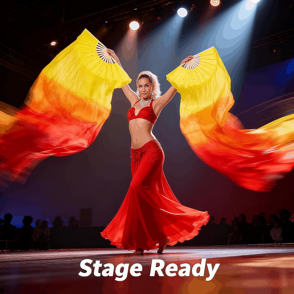 【Vibrant Color & Premium Fabric】 Features a fiery yellow to red gradient on high-quality artificial silk. This fabric ensures smooth, flowing movements with a luxurious look, perfect for dance props.