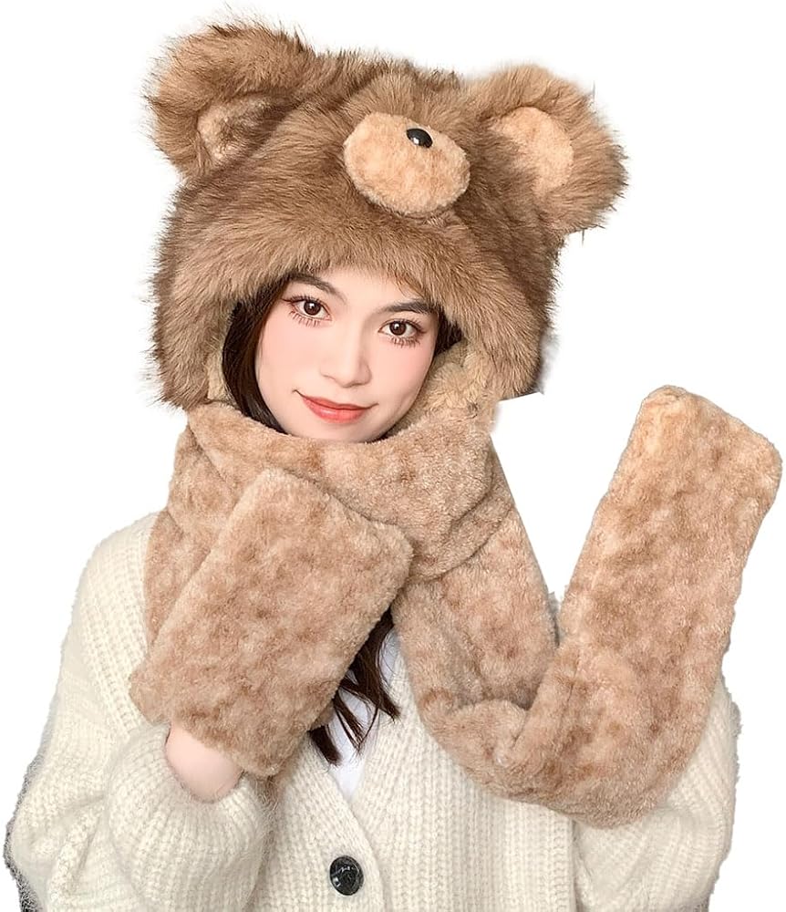 This women's winter 3-in-1 set (hat, scarf, and hand warmers) is an adorable, plush piece featuring playful bear-ear details and a cute facial accent, designed to wrap your head, neck, and hands in cozy warmth. It fits most head sizes effortlessly, making it perfect for daily commutes, festive winter outings, or casual city walks—pairing seamlessly with puffer jackets, sweaters, or casual outerwear. The soft, fuzzy texture delivers lasting comfort, while the whimsical bear design adds a charming, trendy vibe, making it an ideal all-in-one accessory for anyone wanting to stay snug and cute through the cold season.