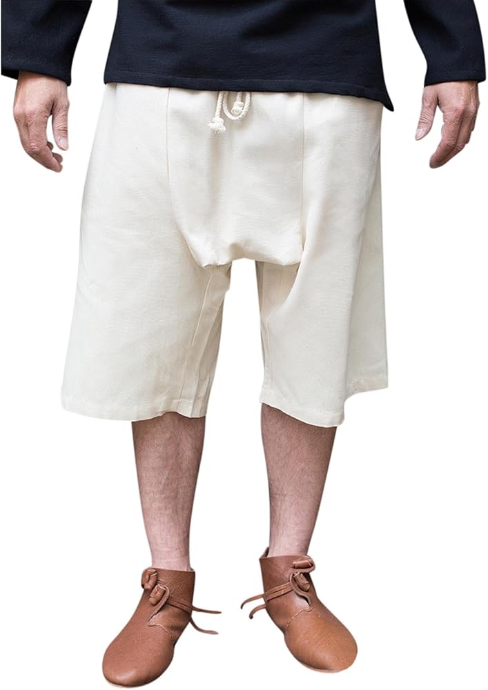 The Braies Gisbert is a medieval undergarment akin to modern boxer shorts. Its origins and design are uncertain, likely evolving from Germanic breeches and becoming underwear after the rise of chausses. Our version features rough cotton fabric with a 12th-century overlap for authentic draping, and an internal drawstring for attachment to chausses like our Wool Chausses Bernulf. Even without chausses, commoners in contemporary illustrations wore braies.