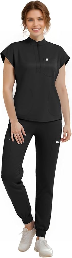 Scrubs for Women Set, Stand-Up Collar Scrub Top & Jogger Scrub Pants, 11 Pocket - Medical Nurse Uniforms