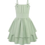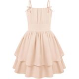 Elegant Tiered Design:This charming spaghetti-strap dress features a beautiful tiered skirt and vertical shirring on the bodice for a flattering fit.The back has an elegant gathered detail,creating a lovely silhouette perfect for special occasions