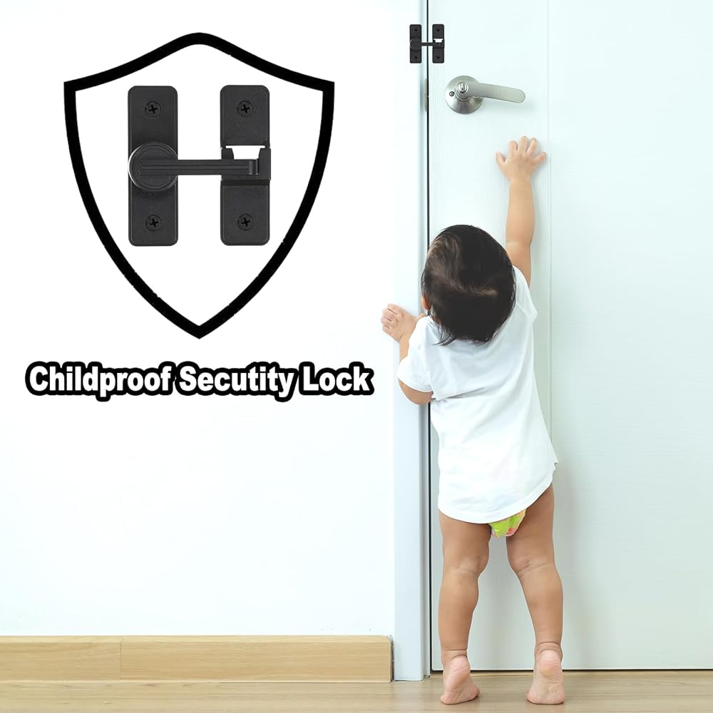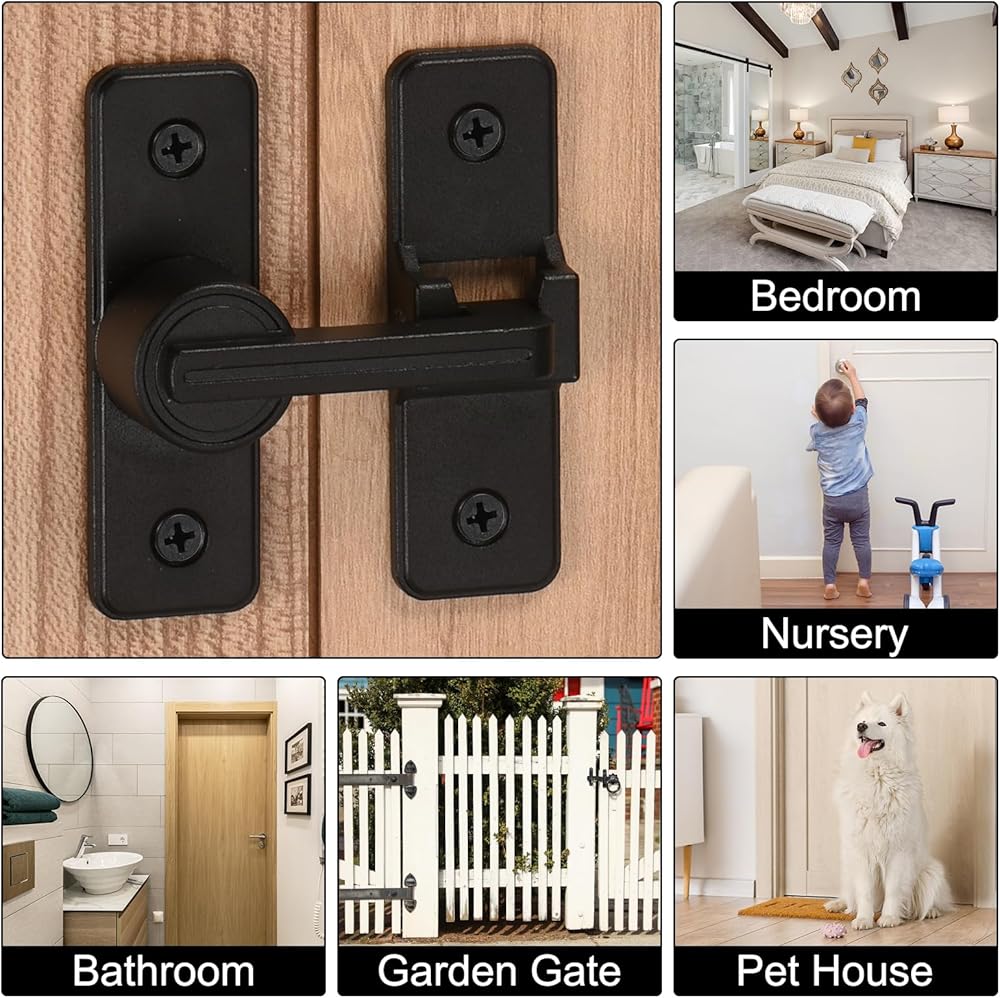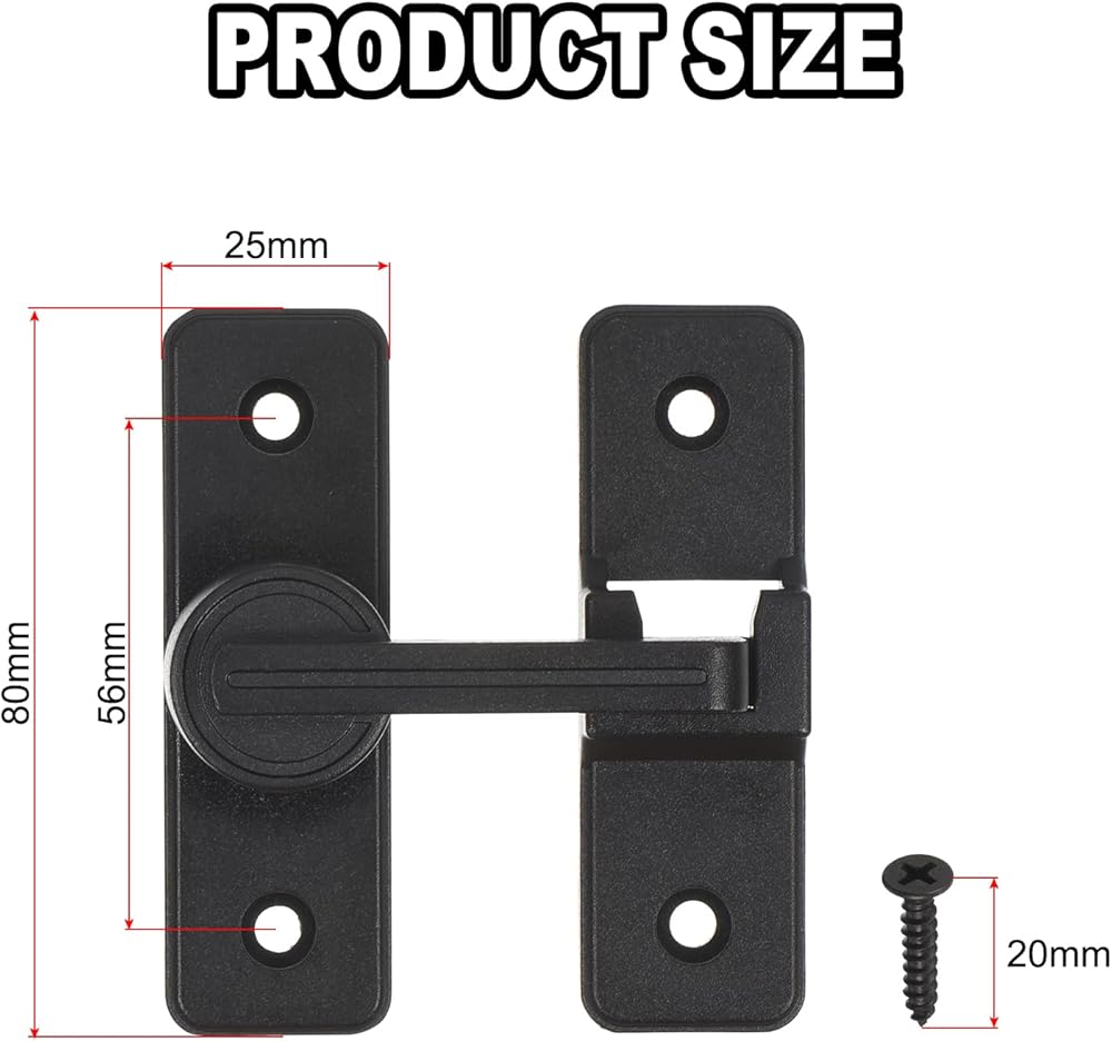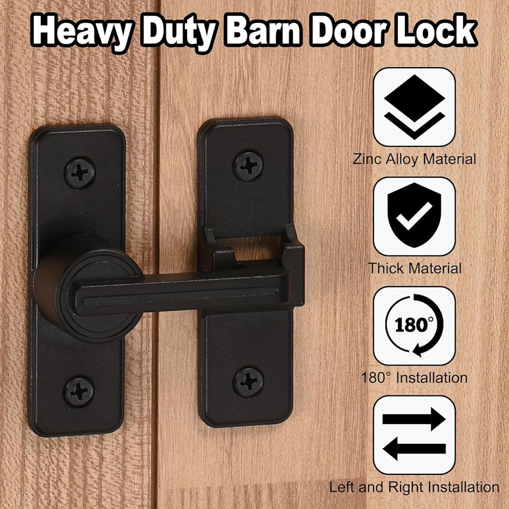 The barn door latch is designed with 180-degree rotating latch that swing freely in a circle, but also maintain vertically/horizontally without effort.
