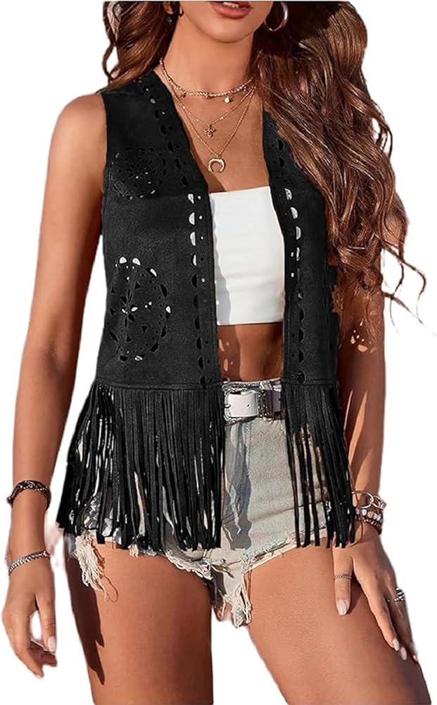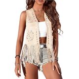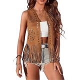 DESIGN: Cowgirl vest for women western, with fringe, cropped length, front open, eyelet design, sleeveless tassel outwear vest jacket; 70s trendy streetwear