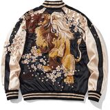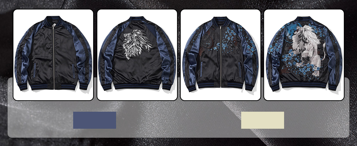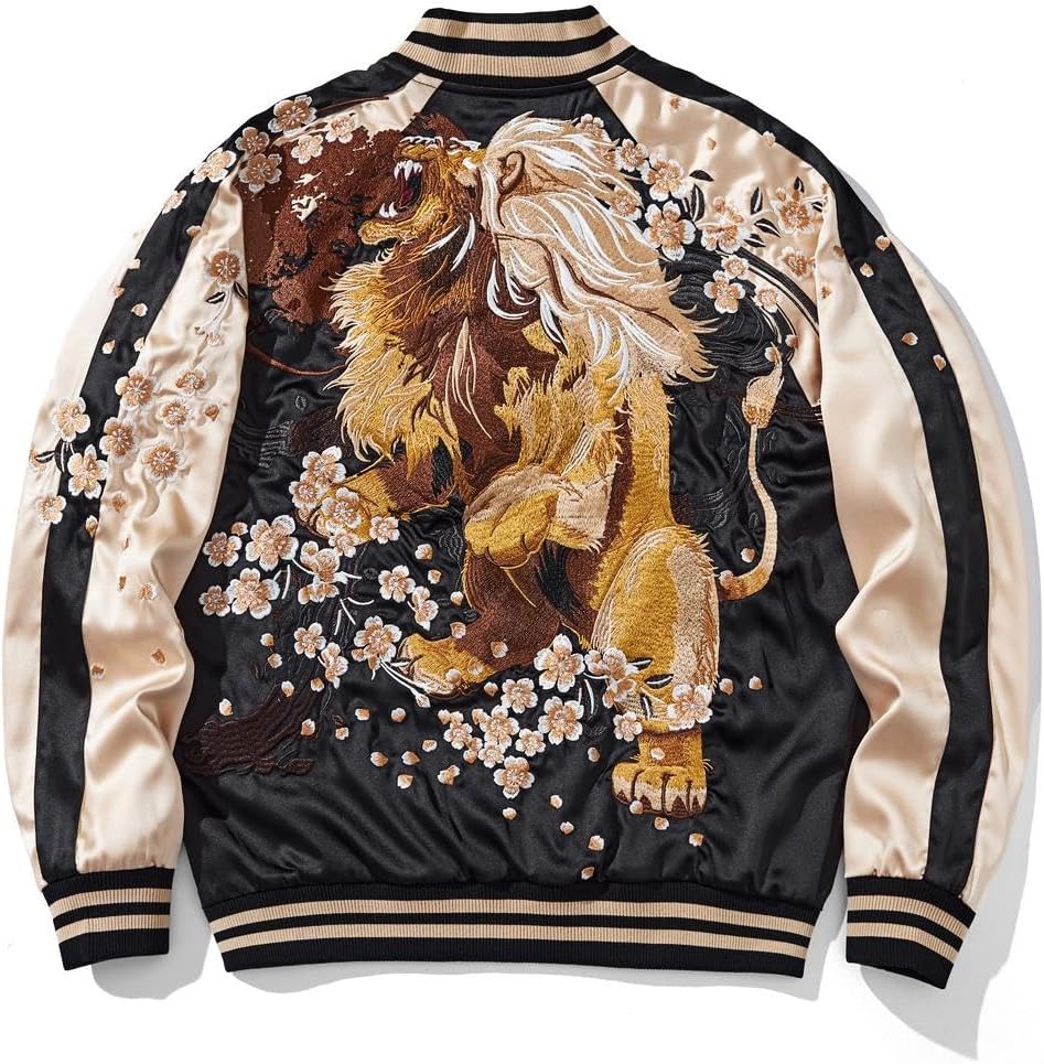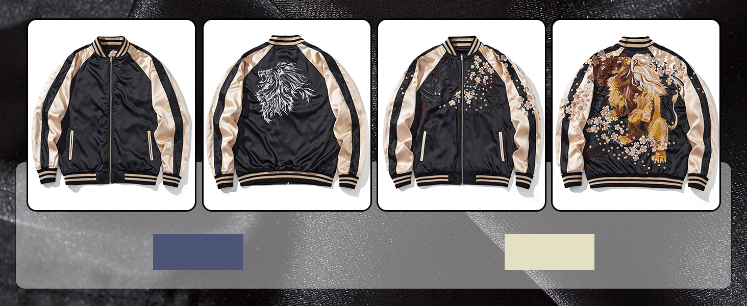 Eye-catching Embroidery: The back of this varsity jacket features a large embroidered design that is very eye-catching.At the same time these embroideries have a unique symbolic meaning.The lion embroidery on this mens jacket symbolizes strength and resistance, while the cherry blossoms symbolize fleeting beauty and destiny, the combination of which expresses the need to fight even when you know the end is short