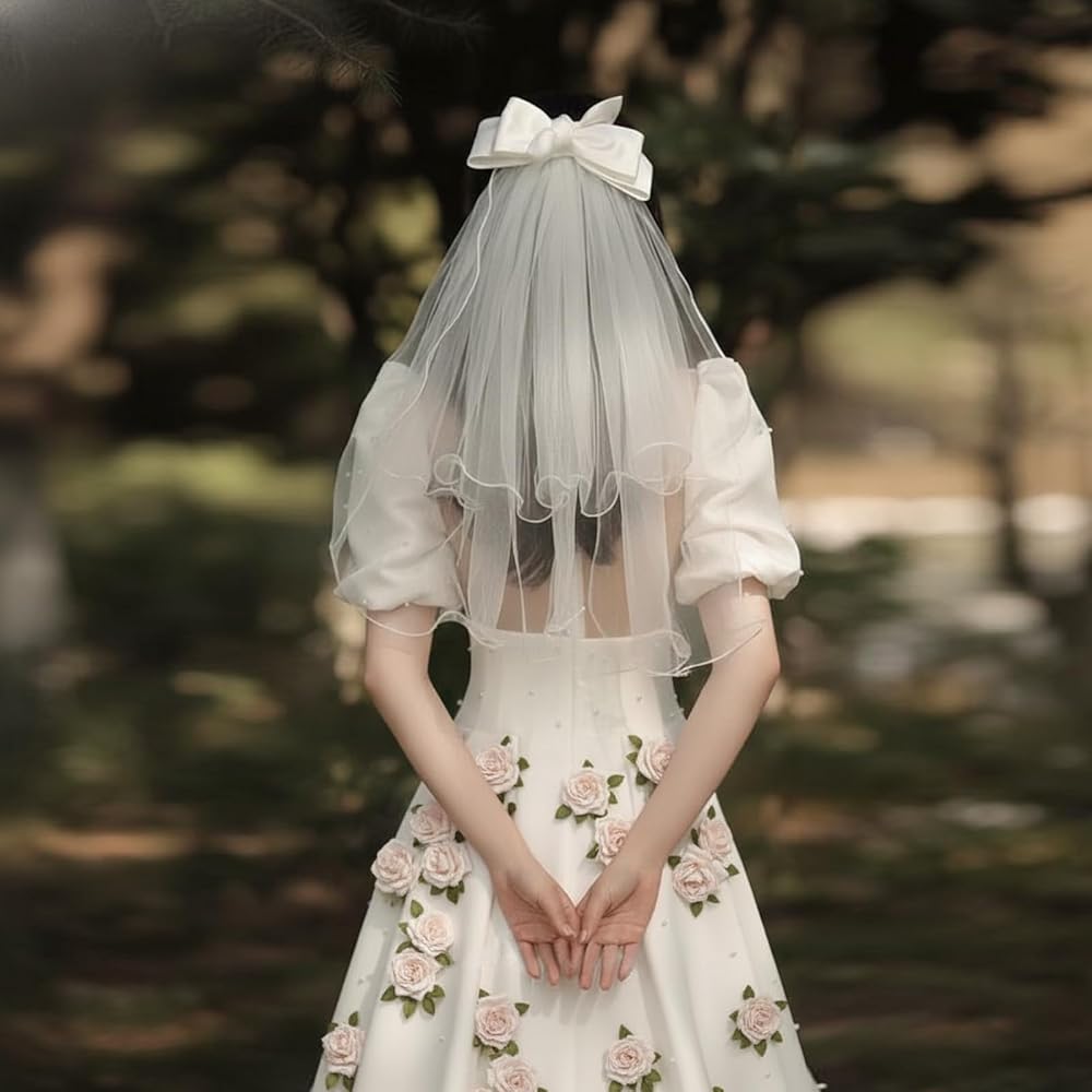 Elegant Bridal Veil for Modern Brides:Instantly elevate your wedding day look with this short veil.featuring a delicate, cascading two-layer design. The soft, flowing tulle creates a subtle yet stunning silhouette, perfect for a bachelorette party or as a trendy secondary veil