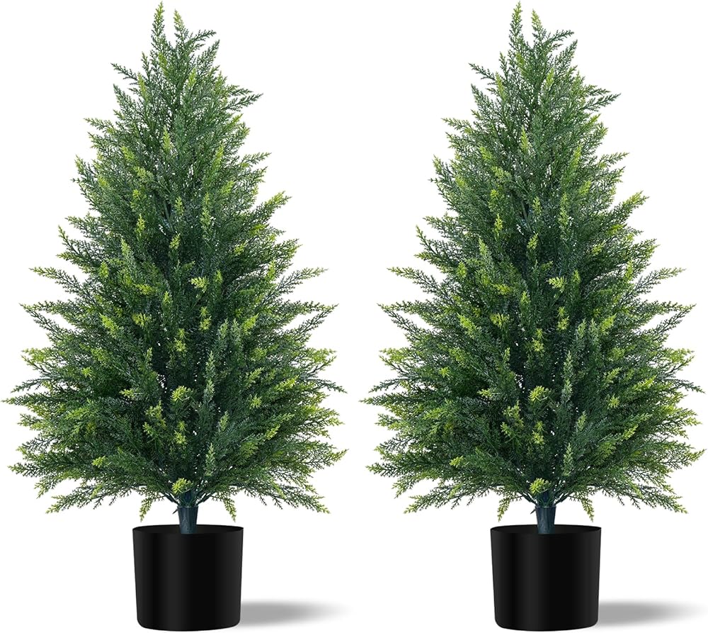 🎄【Realistic Topiary Tree】 These 3-foot artificial cedar trees feature dense, realistic foliage and an elegant look. Each comes in a sturdy plastic pot, but you can elevate their style by placing them in decorative planters to complement your home's decor.