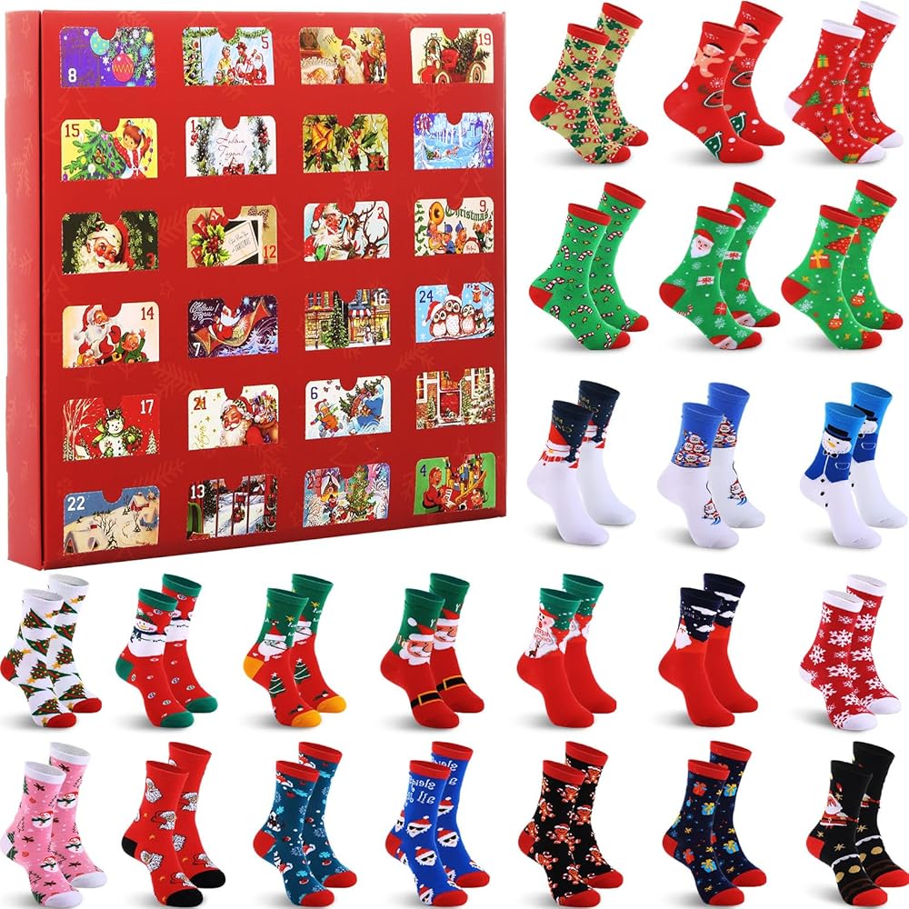 24 Days of Holiday: our Christmas Stocking Advent Calendar 2025 features 24 pairs of Christmas stockings with classic patterns such as elk, Santa Claus, snowmen, gingerbread men and more; That is a delightful Christmas gift for your family and friends