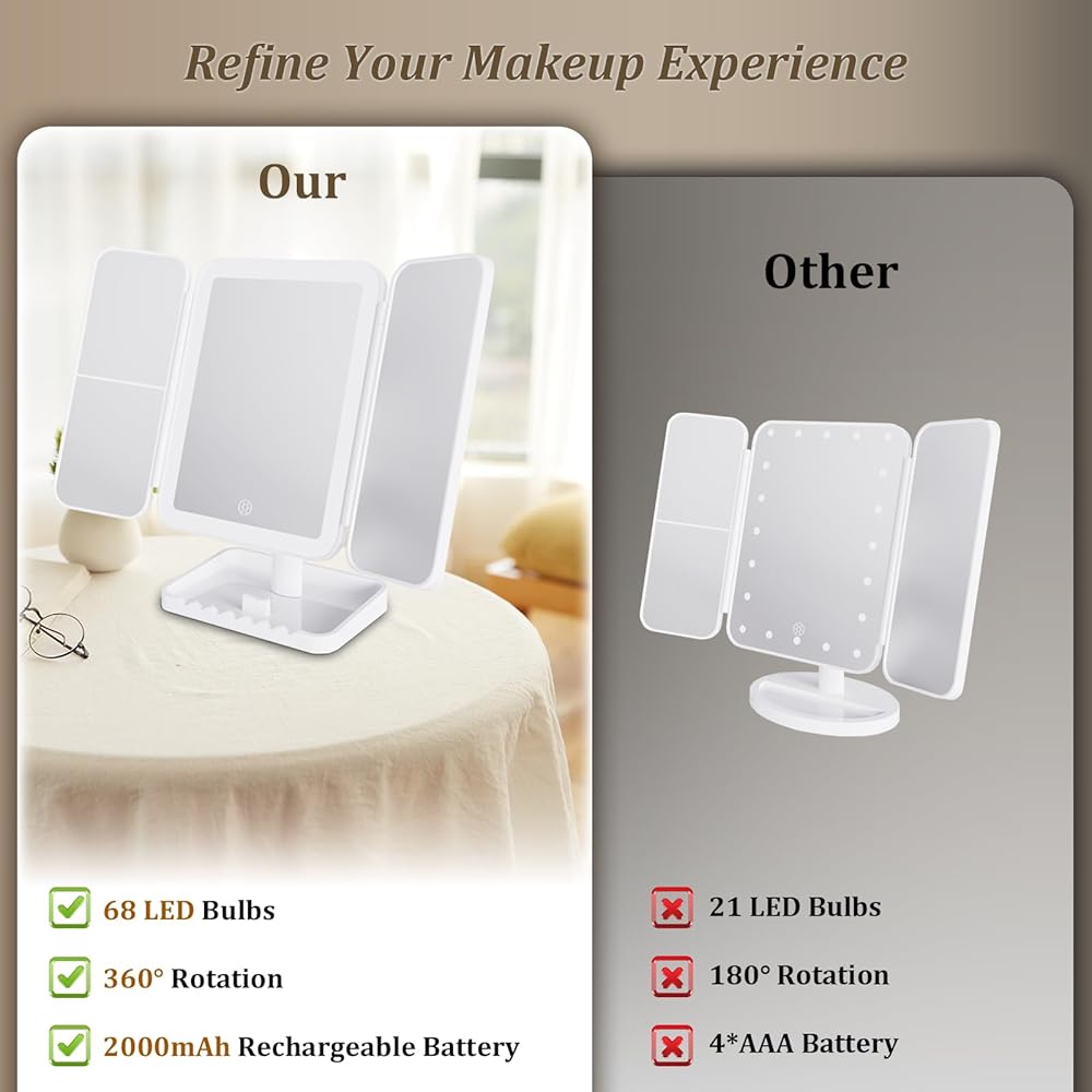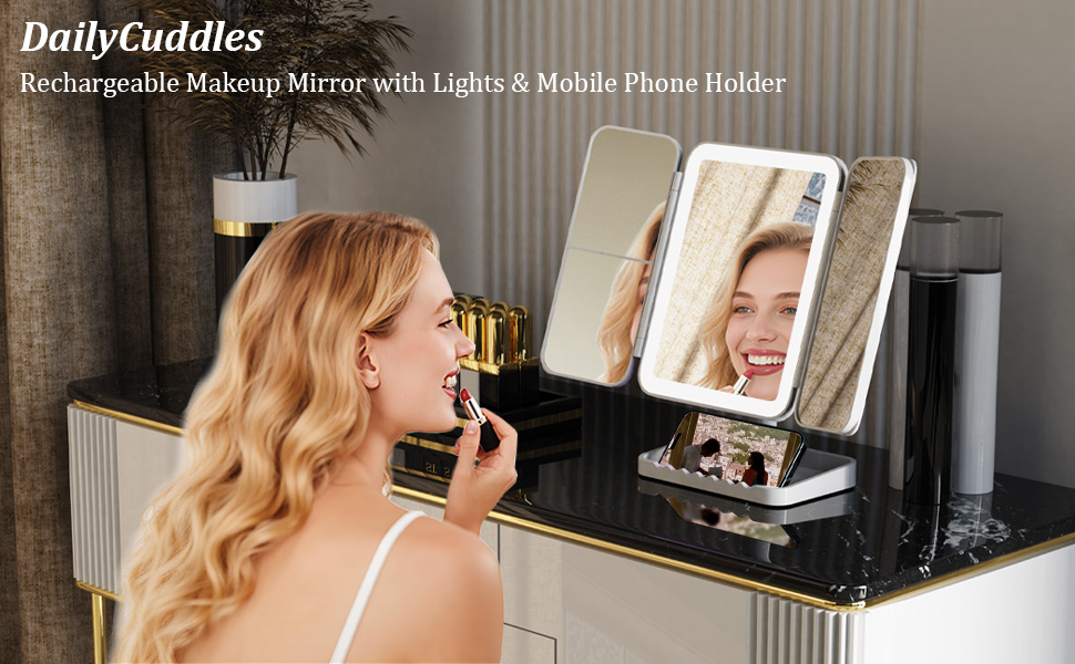 Full 360° Rotation: DailyCuddles makeup mirror can be rotated 360°, which allows you to easily adjust the angle that suits you; The tri-fold design saves space in bedrooms or bathrooms, functioning as a compact vanity mirror or phone holder