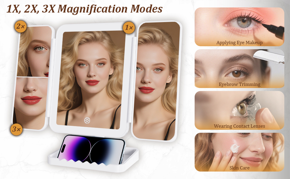 1X, 2X, 3X Magnification Modes: Our vanity mirror with lights can bring you a more comfortable makeup experience. 1X magnification mirror is better and clearer for your daily makeup, while 2X/3X magnifying mirror provides you with more delicate operation for close-ups or tweezing