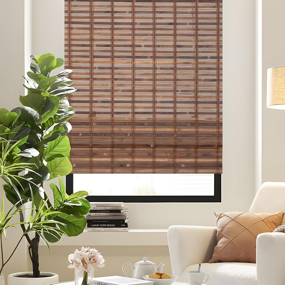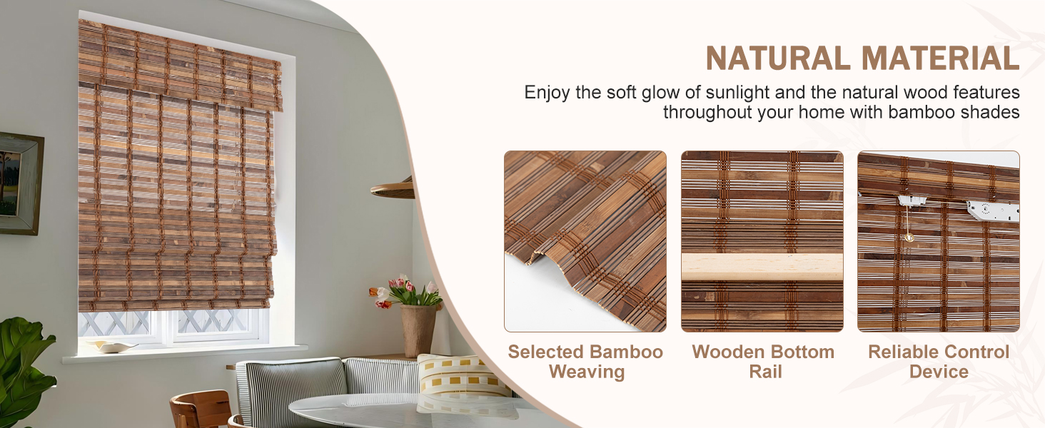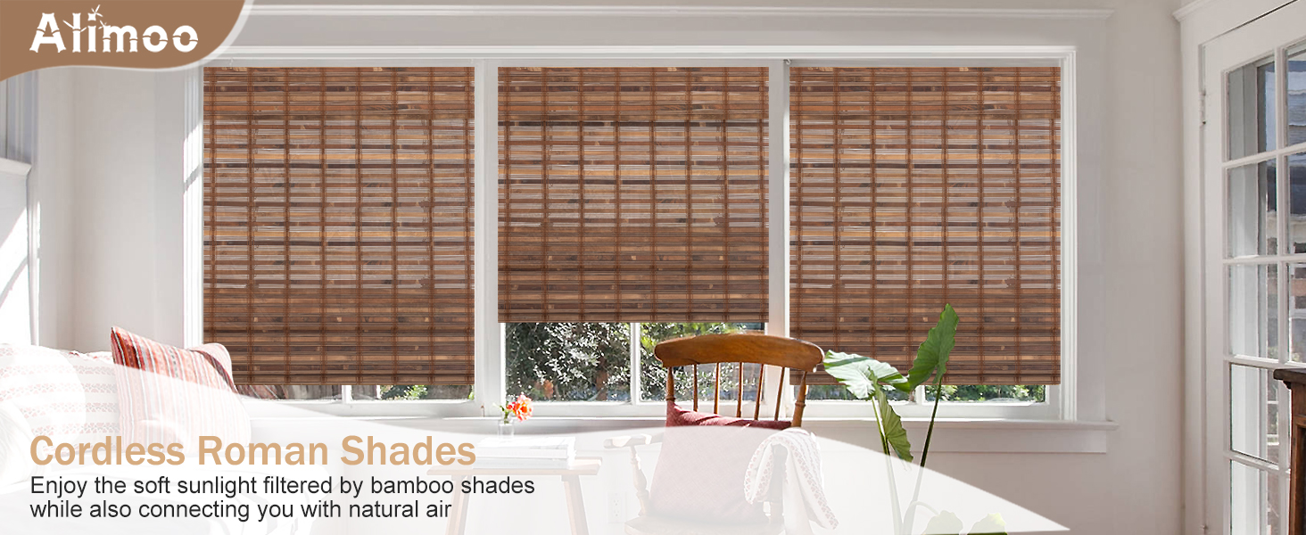 【NATURAL BAMBOO MATERIAL】The cordless roman shades are made of natural and selected bamboo, and are equipped with a wooden head rail to present a beautiful appearance. Cordless Bamboo shades are finely woven and subjected to high-temperature carbonization, making them stronger and more durable. Even when exposed to direct sunlight for a long period of time, window roman blinds are not prone to fading or damage