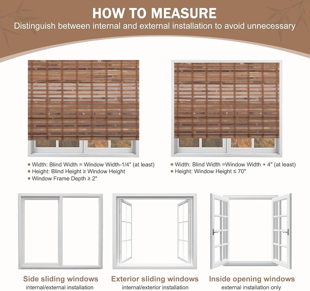 【PRODUCT SIZE & INSTALLATION】 Blinds Length: 72 inches; Blinds Width: 24-72 inches, 8 sizes in total. The cordless bamboo blinds come with a full set of installation accessories and detailed instructions for quick installation. For inside mount, the window frame depth needs to be at least 2", and the bamboo blinds width should be shorter than the window width by at least 1/4". For outside mount, it needs to be 4" wider than the window