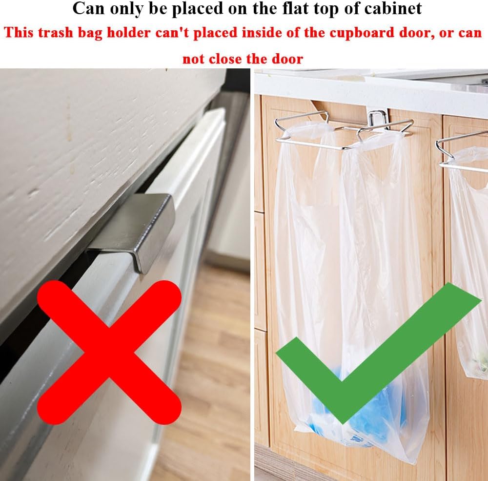 【Garbage classification】 Notice: 1) This trash bag holder can't placed inside of the cupboard door, or can not close the door. 2) This trash bag holder can only be placed on the flat top of cabinet door, or can not close the door. When cooking in the kitchen, is it difficult to store the kitchen waste from washing vegetables and meat? If wet garbage is stored for too long, it will give off an unpleasant smell? You need this product.