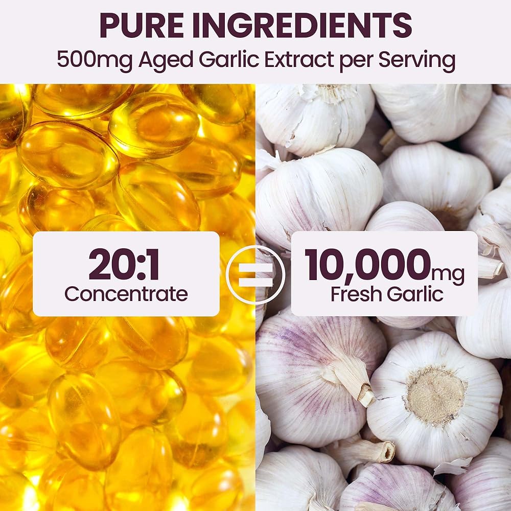 تركيبة نقية وعالية القوة: توفر كبسولات الثوم الناعمة عديمة الرائحة جرعة قوية تحتوي على 500 ملجم من مستخلص الثوم المعتق النقي لكل حصة مكونة من كبسولة هلامية. مستخلص من بصيلات Allium sativum ومركز بنسبة 20:1، ويعادل مستخلص الثوم النقي هذا 10000 مجم من الثوم الطازج، مما يوفر مصدرًا نظيفًا ومركزًا لفوائد الثوم التقليدية.