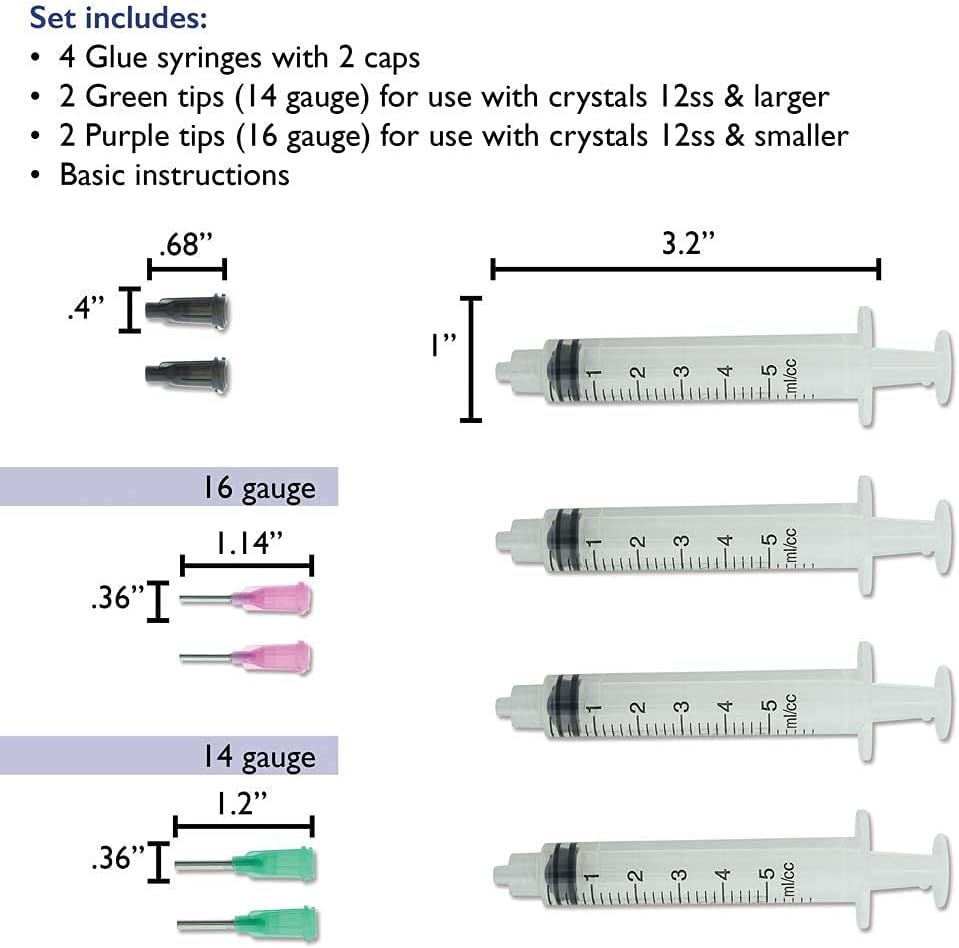 ADHESIVE APPLICATOR: Included in the resealable box are 4 plastic single use syringes, 2 green tips, 2 purple tips, 2 black caps, and basic instructions. The green tips are 14 gauge and for use with crystals 12ss and larger. The purple tips are 16 gauge and for use with crystals 12ss and smaller.
