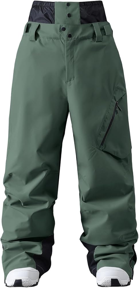 SKI PANTS DESIGN: The snowboard pants features adjustable waistband and windproof skirt, loose fit, two slant zipper pockets and two unique cargo pockets, the zipped inner thigh openings, inner elastic cuffs and outer expandable zipper at the bottom of the snow pants