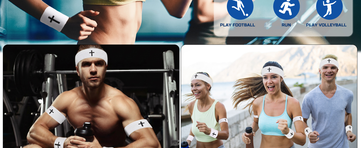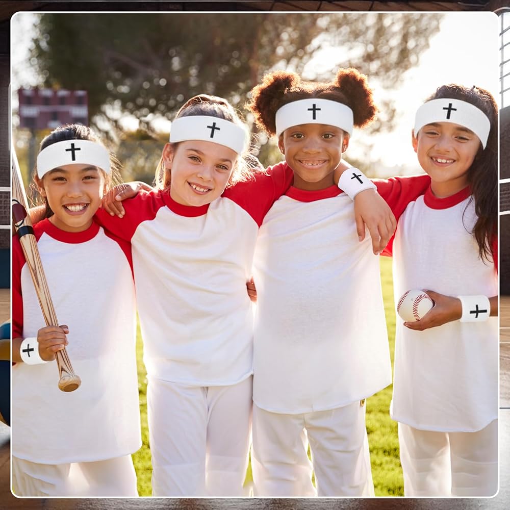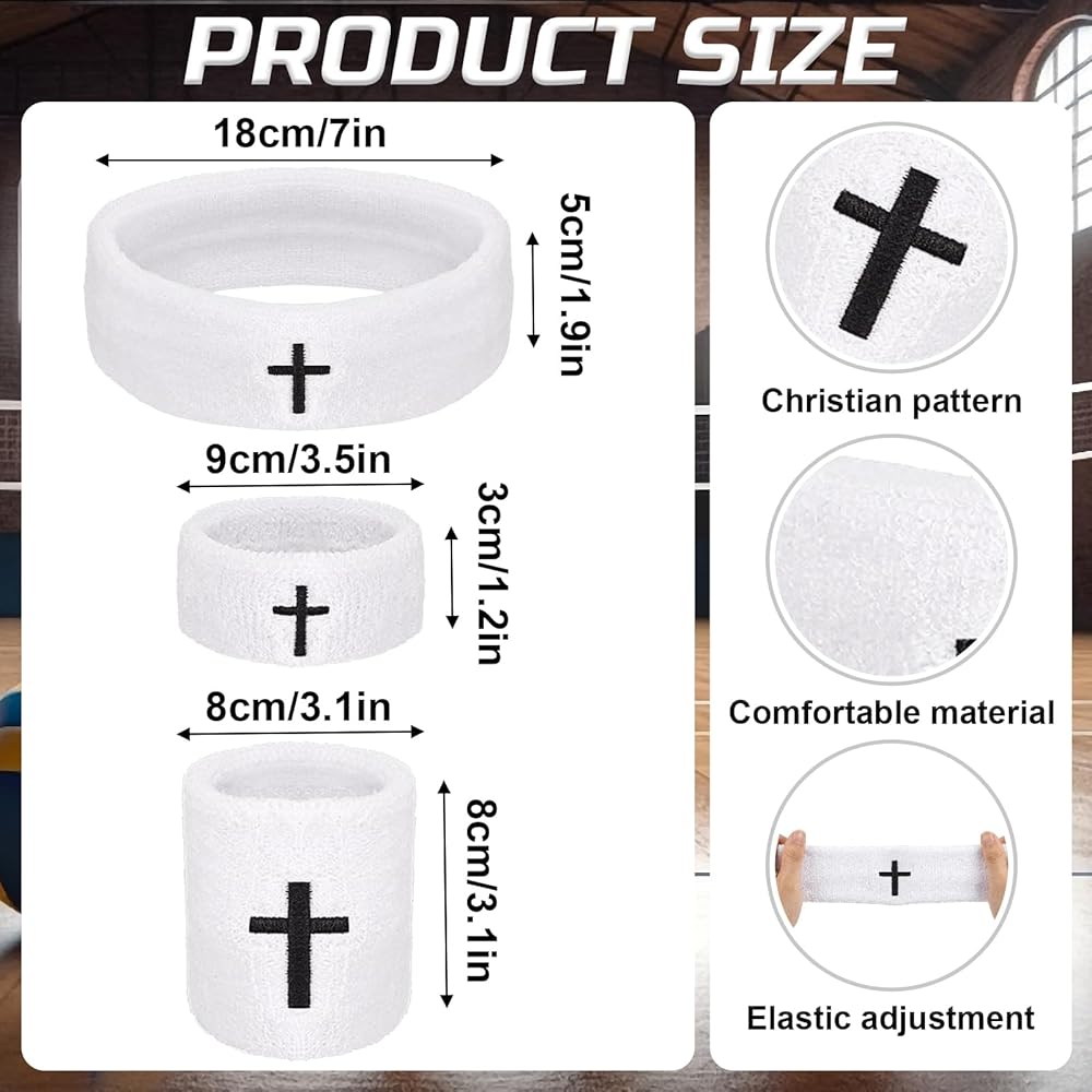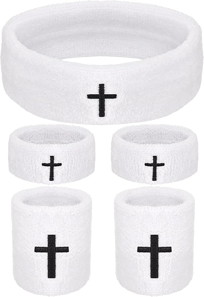 5 PCS Cross Sweatbands Set, Unisex Sports Headband and Wristbands Armbands White Cotton Christian Faith Inspirational Sweatband Set for Basketball Tennis Gym Sports Running