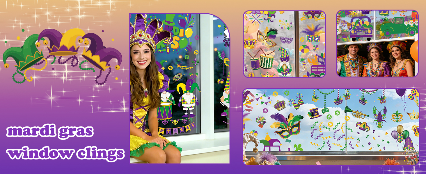 Easy to Use: These Mardi Gras window clings attach via static cling; clean the surface, spray a little water, then press and adjust as needed, ideal mardi gras window clings for quick parade-themed decorating in any room