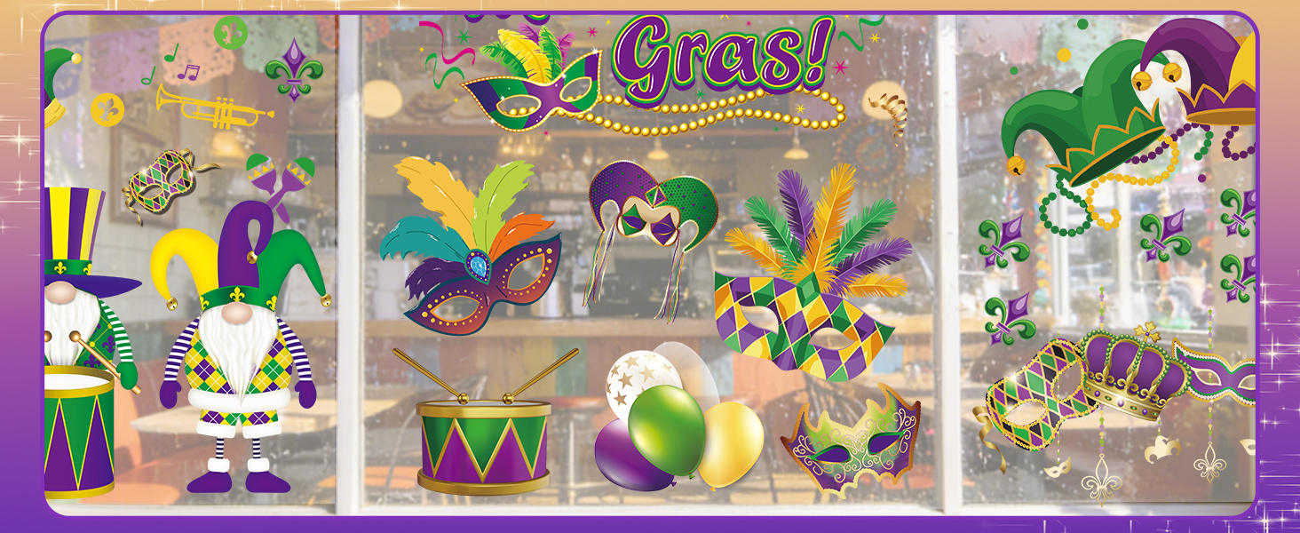 Wide Application: Great Mardi Gras window clings for glass, mirrors, doors, tiles, and smooth walls, ideal holiday window clings for Mardi Gras home decor in living rooms, classrooms, offices, and parade-themed setups