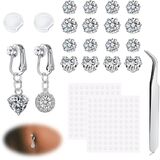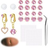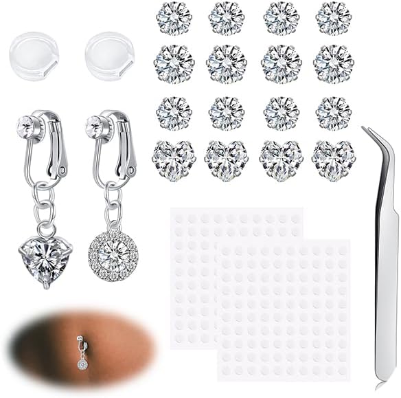 [Item Contain]: 2pcs clip on belly button ring fake belly button ring,2pcs pain relieving silicone pads,16pcs stick on balls for stick on belly button ring fake,stickers and tool