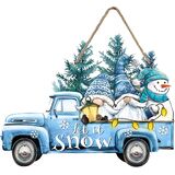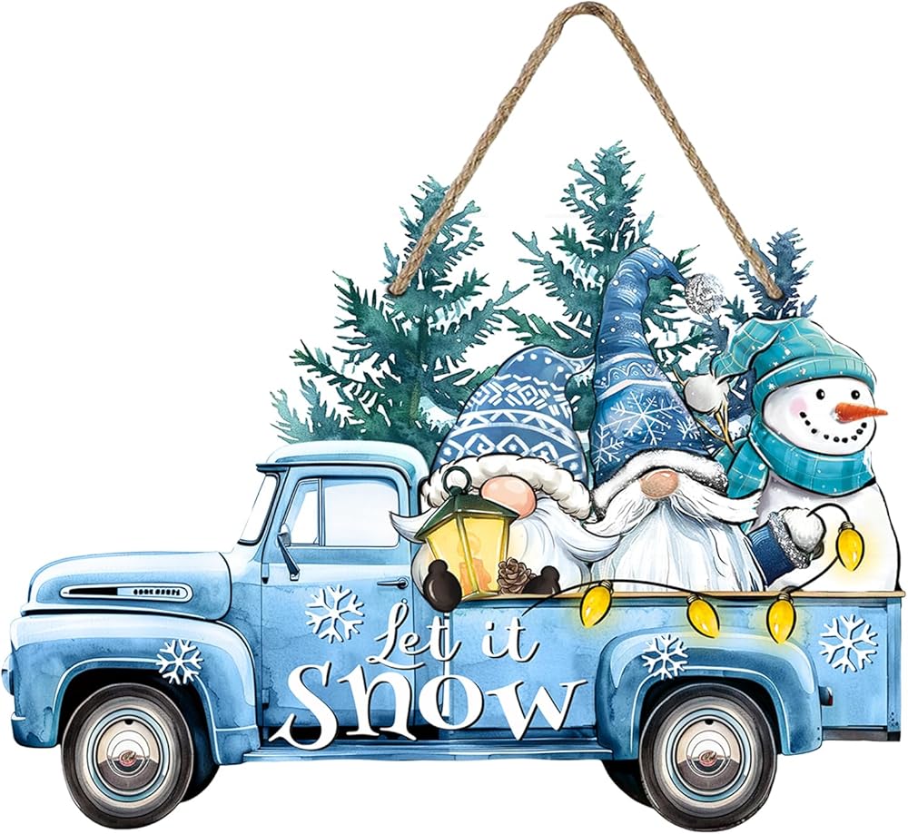 Winter Blue Truck Gnome Snowman Front Door Sign, Let It Snow Pine Tree Wood Hanger Outdoor Outside Porch Home Decor, Farmhouse Christmas Snowflake Wooden Wreath Indoor Wall Hanging Decoration
