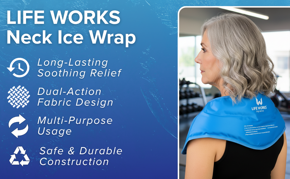 The LIFE WORKS Gel-Filled Neck Ice Pack delivers targeted cooling to muscles, joints, and tendons. The professional-grade gel remains flexible at -13℉, providing consistent cold therapy for swelling and everyday discomfort. Its dual-fabric design features a plush side for comfort and a nylon side for deeper cooling. Durable, leakproof, and versatile for use on the neck, back, legs, and more.