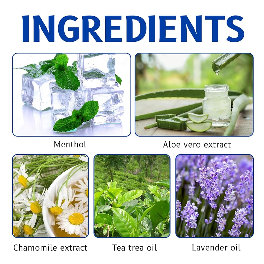 - Natural Ingredients: Contains cold-brewed menthol, lavender oil, aloe vera extract, amino sugars, chamomile extract, tea tree oil, and lavender oil.
