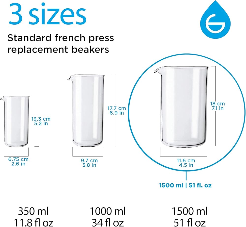 ⭐ [UNIVERSAL STANDARD DESIGN] This 1000 ml - 34 fl. oz French press replacement glass beaker is a standard size that fits most major brands of French Press Coffee makers including GROSCHE and others
