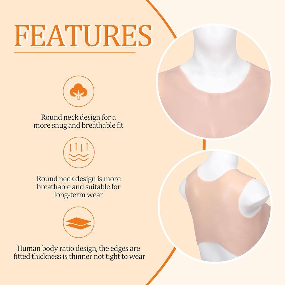 Material: silicone breast plate made of pure medical silicone , two types of breast fillers ,elastic cotton filler fake boobs is more light weight, strong chest shape easy to move, silicone filler touch soft, breast shape is more realistic
