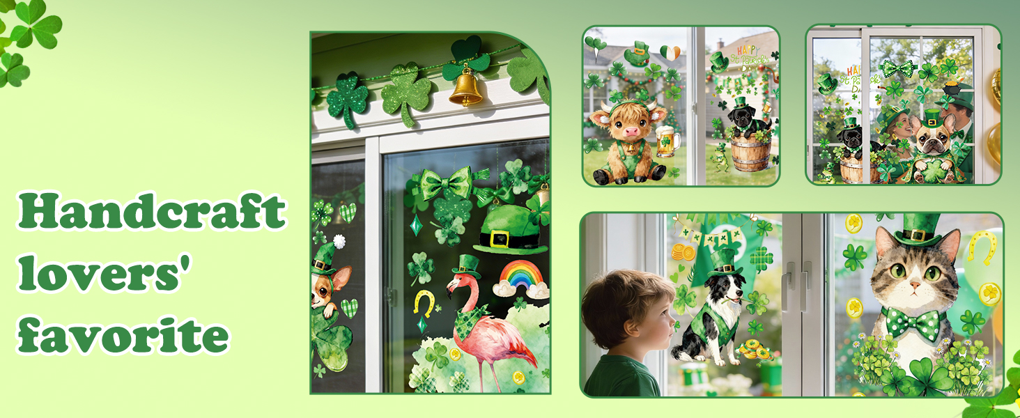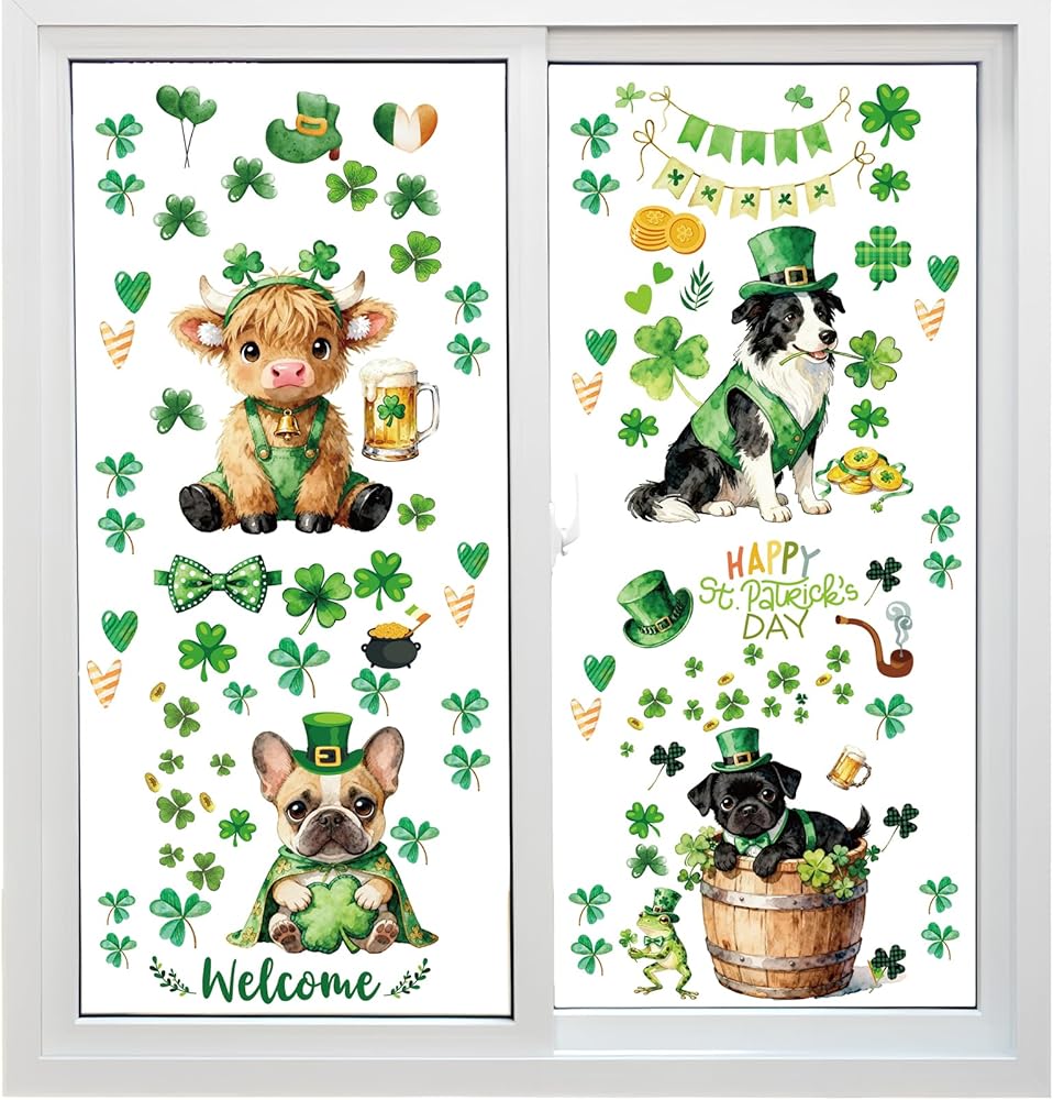 Material: These saint patricks day window clings use quality PVC with clear prints of shamrocks, pets, bows, gold coins, and green accents, great for st patrick's day window clings and spring window stickers
