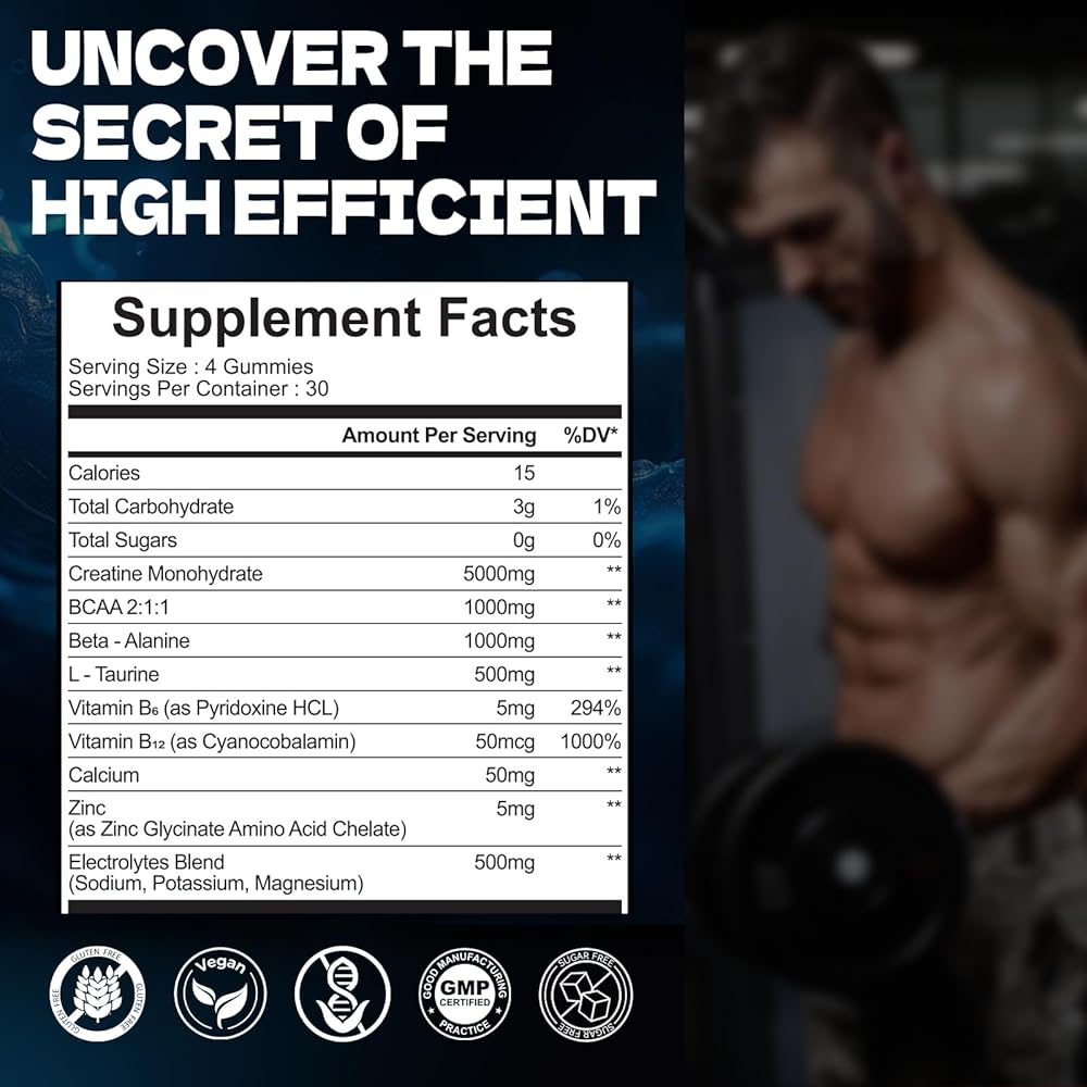 Easy to Carry, Enjoy Conveniently: 4 gummies per serving, 120 total – that's a 30-day supply! Designed for fitness enthusiasts, it offers the convenience of on-the-go nutrition without the hassle of traditional supplements. Take it before or after your workout for timely support to complement your muscle growth goals and post-exercise recovery