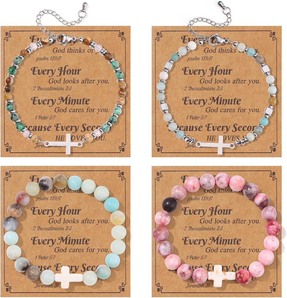 Cross Bracelet for Women: You will receive 4 message cards, 4pcs beaded cross bracelets and 1pc Wooden Cross Fidget , including amazonite, pink zebra etc. These cross beaded bracelets are handcrafted from natural gemstone. Natural gemstones have healing and purifying properties