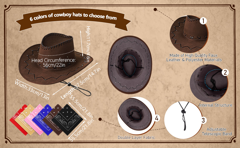 Well Match: these cowboy hats and bandanas can match most boots, can be applied to cowboy clothing style, horseback riding, travel, travel, etc., most kinds of wear, simple design, light and strong, tight and loose version.