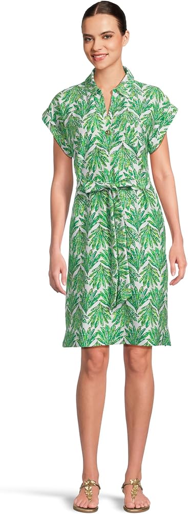 22" Easy fit, short sleeve popover dress with collar, wide placket with gold button, side vents, and separate self sash