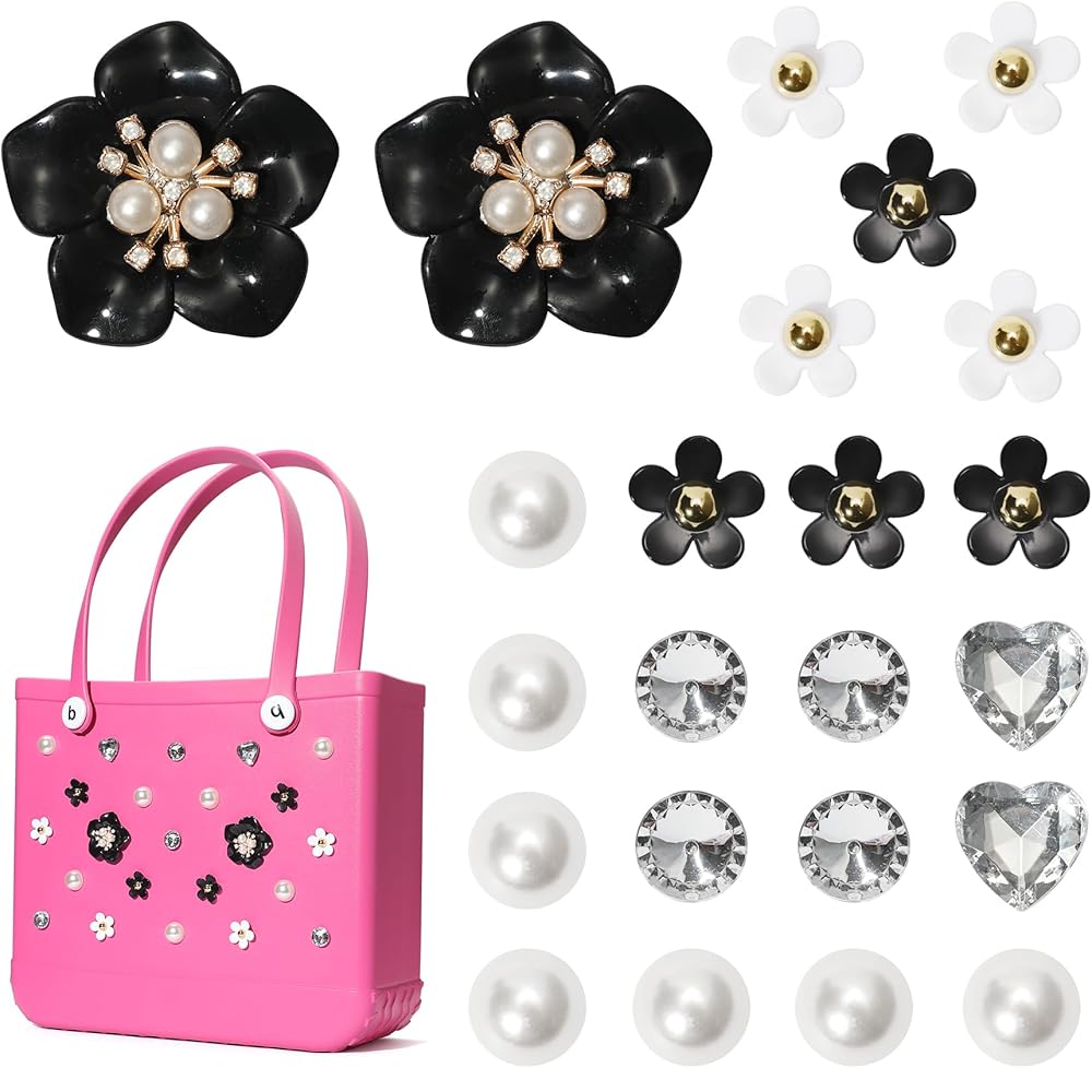 23Pcs Flower Charms Accesories for Rubber Beach Bag, Bling Rhinestones, Pearl Accessories Compatible with Beach Handbags, Inserted Charms for Rubber Totes