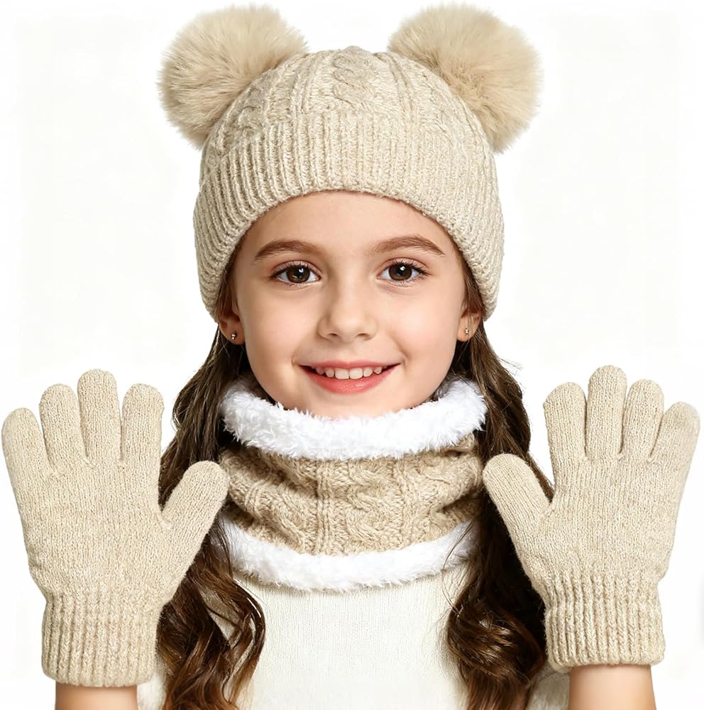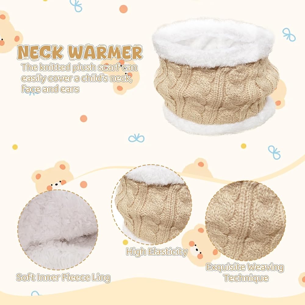 You'll receive a thickened knit hat with a double-ball design, a double-layer tubular scarf, winter gloves, This three-in-one set provides complete winter warmth, crafted from reliable materials for unmatched insulation. Soft and comfortable to wear, the insulated lining ensures all-day comfort, keeping your child warm and cozy throughout the cold season. Its excellent elasticity fits most children (ages 3-10).