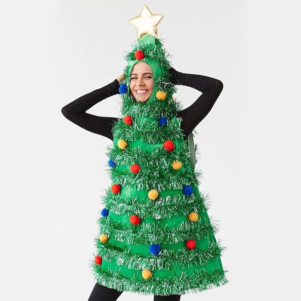 • Design: Adult tree costume;Sleeveless hood tops design,red plush ball and tinsel decor;Christmas Tree Outfit Adult,is suitable for most people,Christmas outfit for women,tree costume