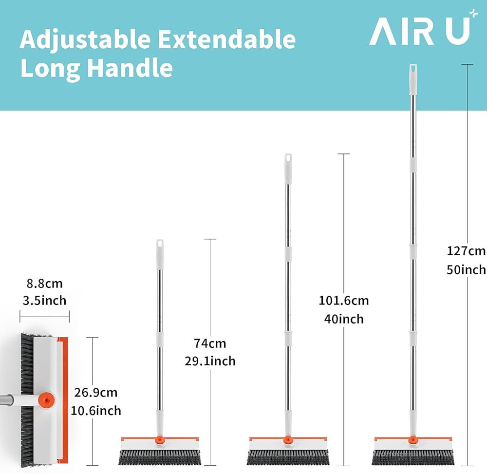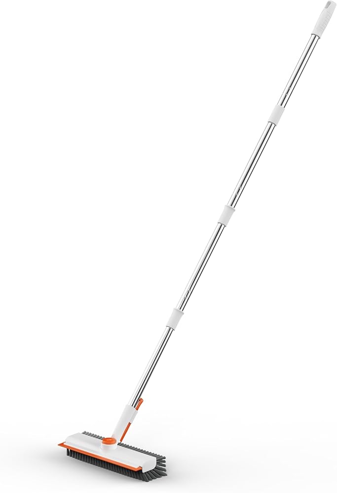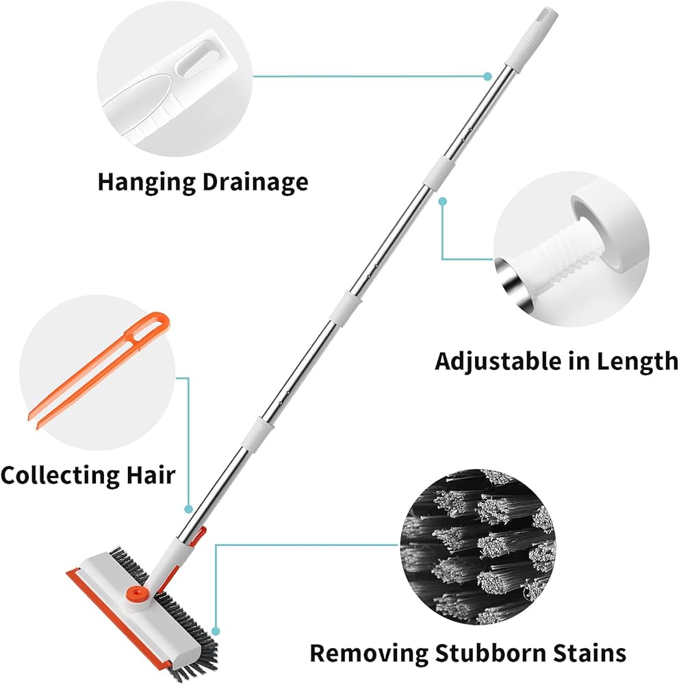 🛁【Adjustable Floor Scrub Brush with Extendable Handle】: Say goodbye to backaches while cleaning! Our floor scrub brush comes with a three-section handle that can be adjusted to your preferred height (30-40-50 inches). No more bending or straining—clean floors comfortably and efficiently.