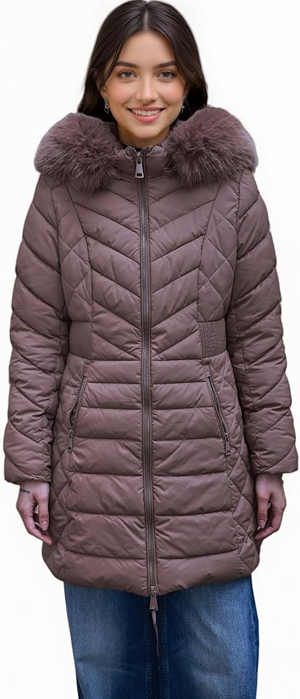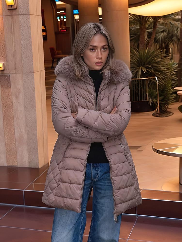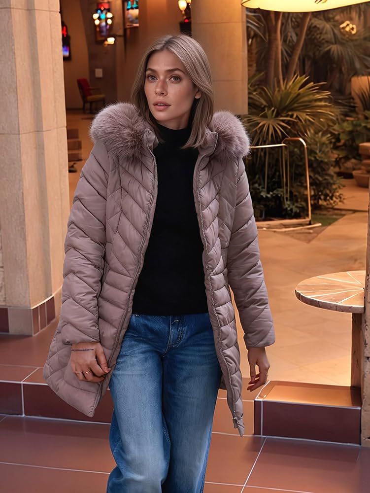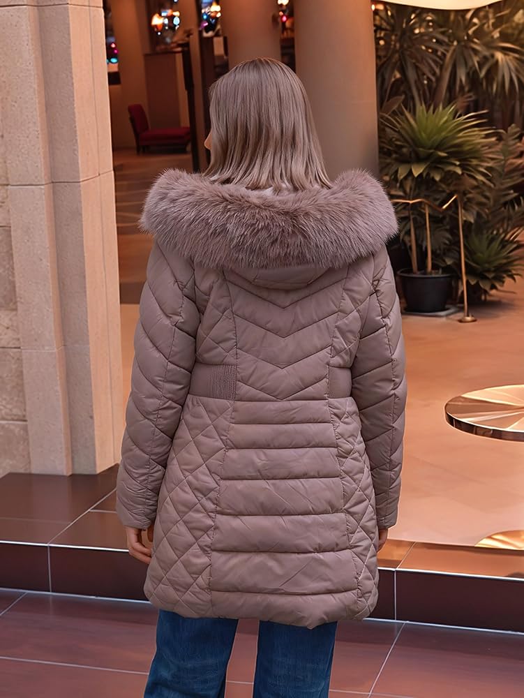 XULIKU Women Puffer Parka Coat with Faux Fur Collar Hooded, Winter Mid-Length Warm Quilted Jacket, Zipper Up Overcoat