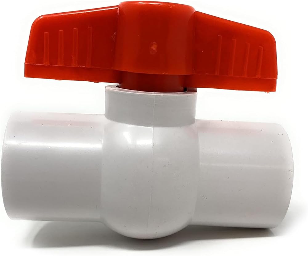 Shut off Ball Valve for 1/2 inch water pipes, Red Easy Quarter-Turn T-handle, Slip-Joint threads, White PVC plastic, for Water Project Plumbing & Irrigation, Valvula Llave de Bola Plastica Sin Rosca