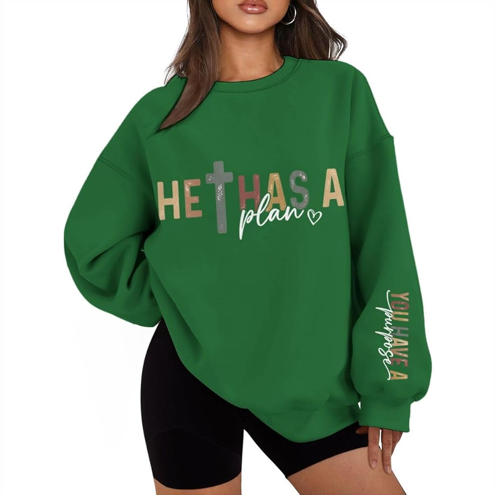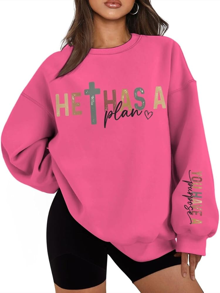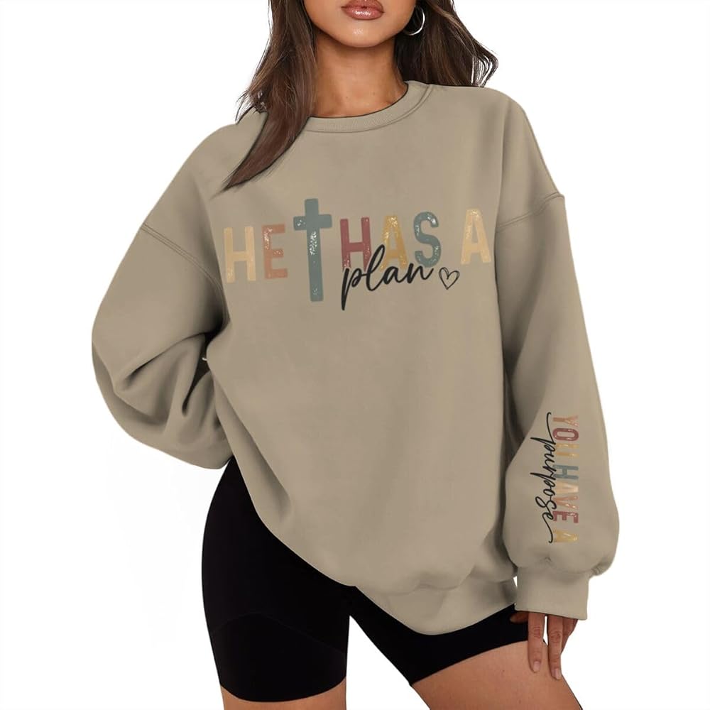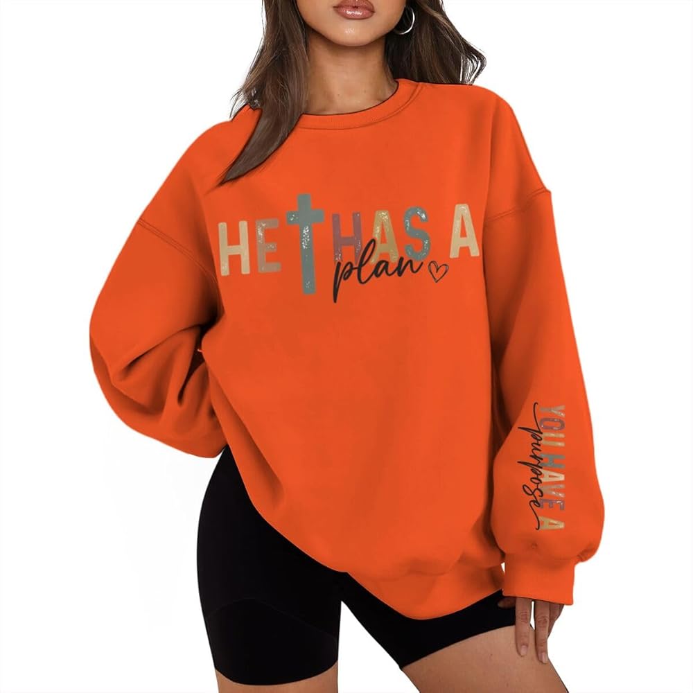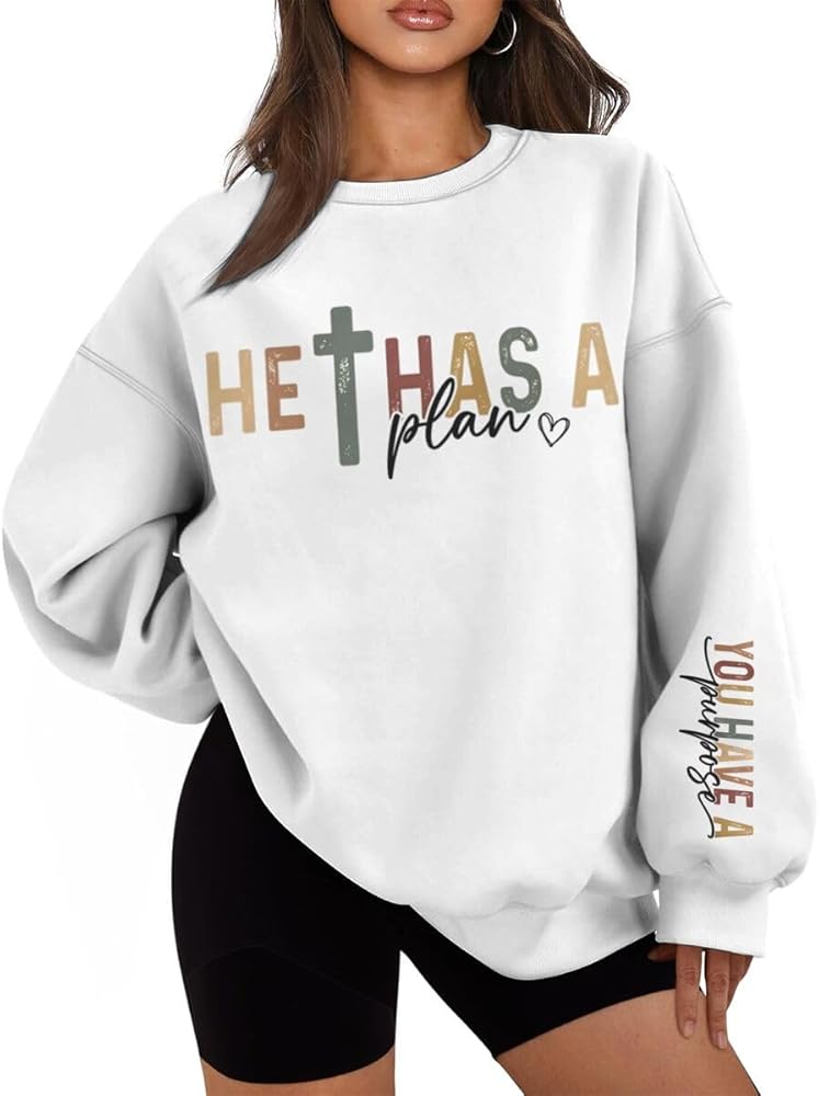 Feature: Christian Religious Jesus Aesthetic Sweatshirt, Bible Verse Shirt Oversized Sweatshirt, Christian Faith Pullover Tops, the front of this graphic sweatshirts is printed with "He Has A Plan" and the left sleeve features "You Have A Purpose".