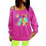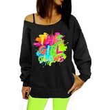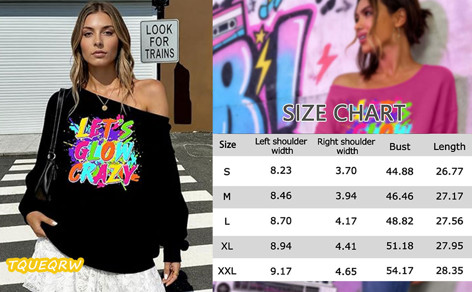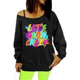 Material: Let's glow crazy 80s neon sweatshirt, it's made of cotton blend, it is soft and comfortable lightweight, breathable, and comfortable to wear. This off-the-shoulder sweatshirt adds a flirty and fashionable touch to your wardrobe